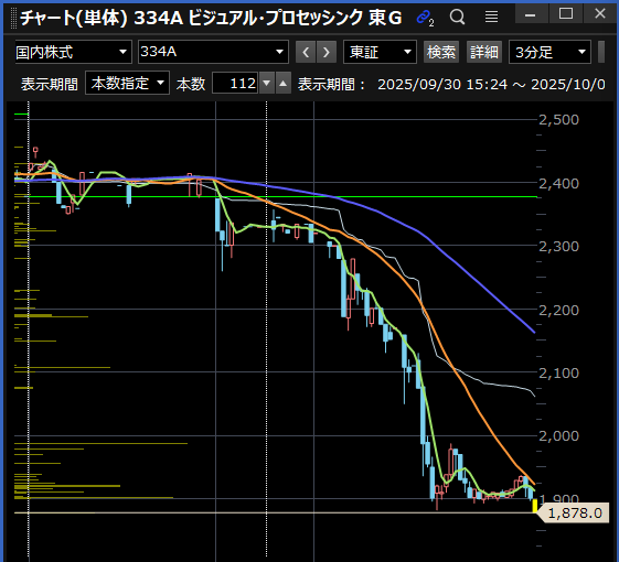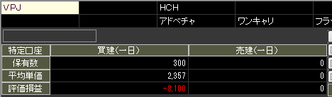11時頃に ビジュアル・プロセッシング・ジャパン の下げで指値が拾われたけど、弱すぎて損切りしたくてもできずに後場に持ち越し。