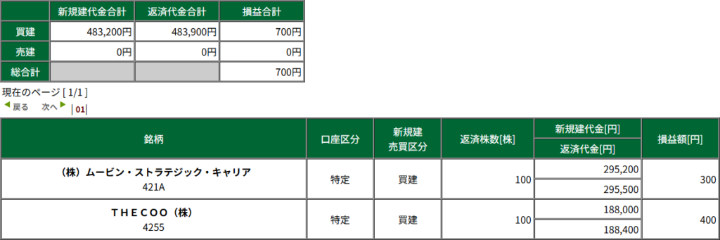 後場、早い時間に ムービン で 3ティックと、大引け間際に THE COO で 4ティック。