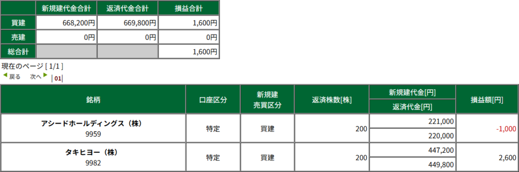 大引けが近くなった頃に、タキヒヨー と アシードホールディングス で買い玉が出来たけど、アシード はぜんぜん動かずそのまま損失で決着。
